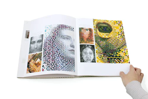 The book is a study of how the traditional pointillism arts have been transformed in modern day into digital pixel arts. The book jacket featured custom hand die cut display typeface.